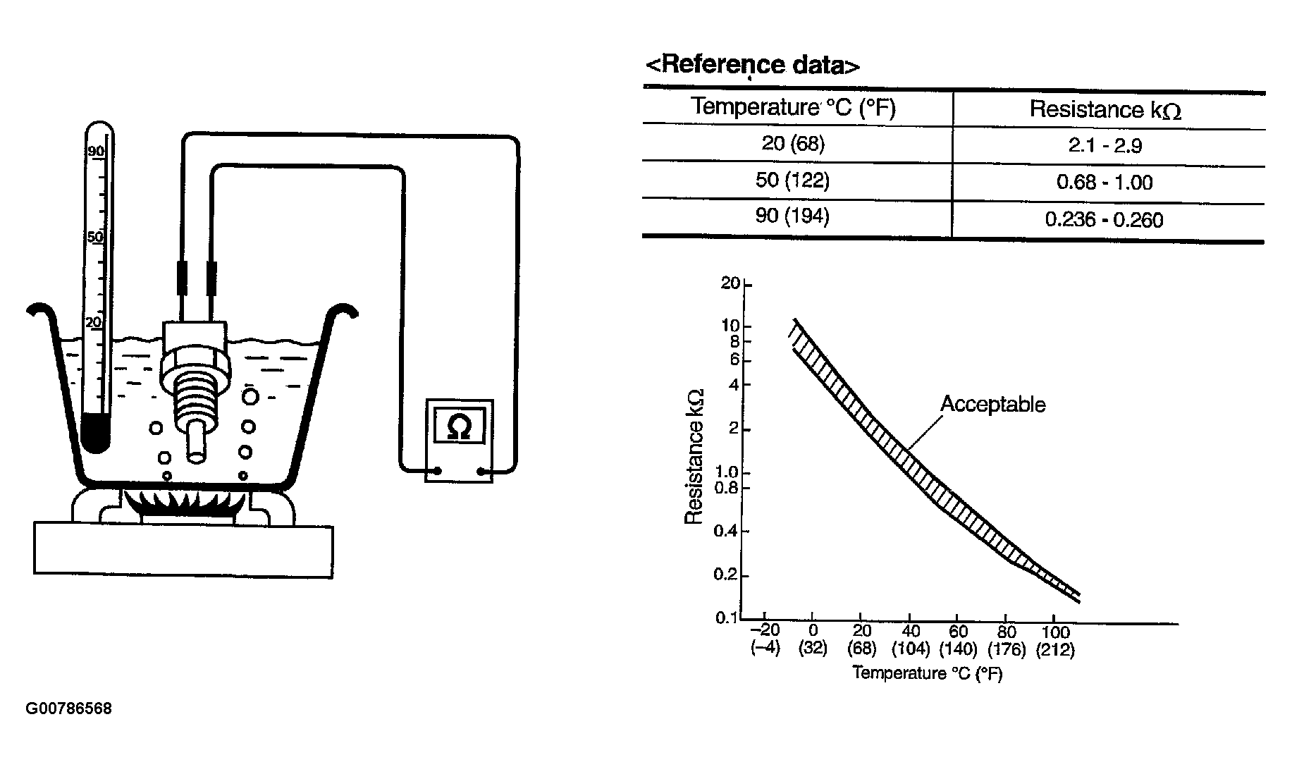 Check resistance between engine coolant temperature sensor terminals 1 and 2 as shown in Figure .