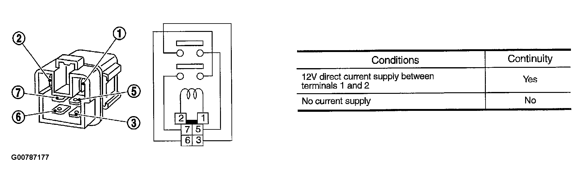 Check continuity between cooling fan relay-2, -3 terminals 3 and 5, 6 and 7 under the following conditions. See Figure .