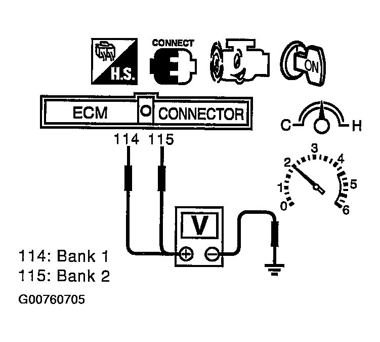 - Set voltmeter probes between ECM terminal 114 [HO2S1 (B1) signal] or 115 [HO2S1 (B2) signal] and ground. See Figure.