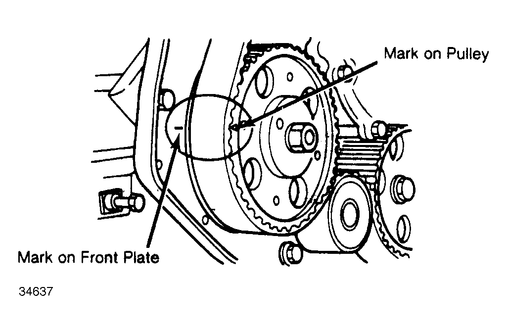 - Check that notch in pump flange is in line with notched line on front plate. Set No. 1 cylinder at TDC of compression stroke. Remove injection pump pulley cover (upper front cover). Ensure timing marks are aligned. See Figure .