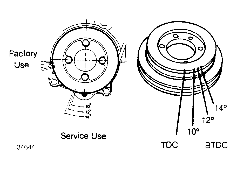 NOTE: Crankshaft pulley has 7 notched lines (3 lines in one area and 4 lines in another). Use group of 4 lines for static timing. Group of 3 lines is for factory dynamic timing.