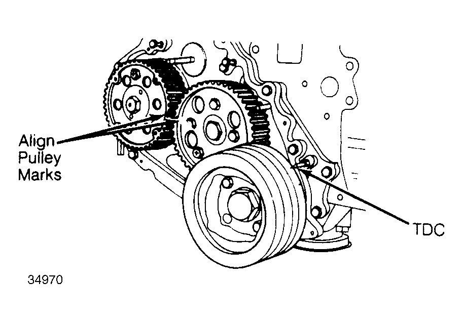 - Ensure notch in pump flange is in line with notch in front bracket. Set No. 1 cylinder at TDC of compression stroke. Remove injection pump pulley cover (right half of timing belt cover) to ensure timing marks are aligned. See Figure