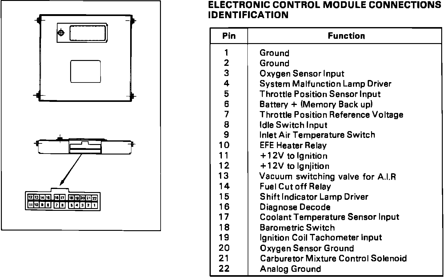 The Electronic Control Module (ECM) is a computer that judges air/fuel ratio as rich or lean according to oxygen sensor output voltage. Based on oxygen sensor and other input data, the ECM generates a controlling signal to the carburetor mixture control solenoid (duty solenoid), causing it to continuously cycle on and off (duty cycle). By changing the duty cycle, the ECM controls air/fuel ratio adjustments.