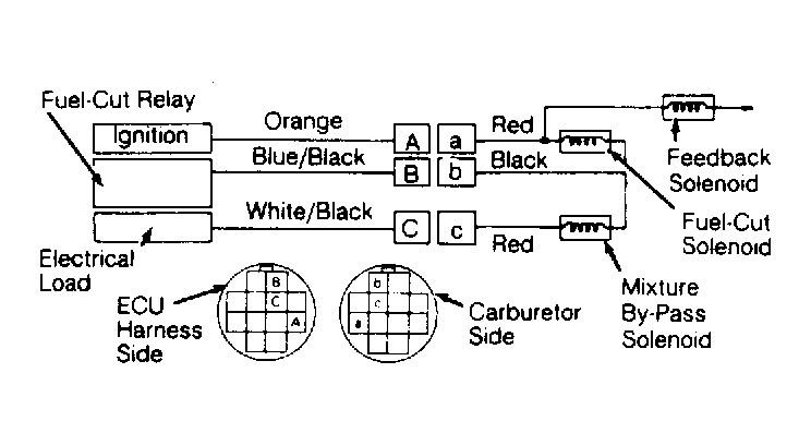 - Connect carburetor connector terminal "C" to battery voltage and terminal "B" to ground. If solenoid does not click, check for open in carburetor harness or defective solenoid. If solenoid does click, solenoid and harness are okay.