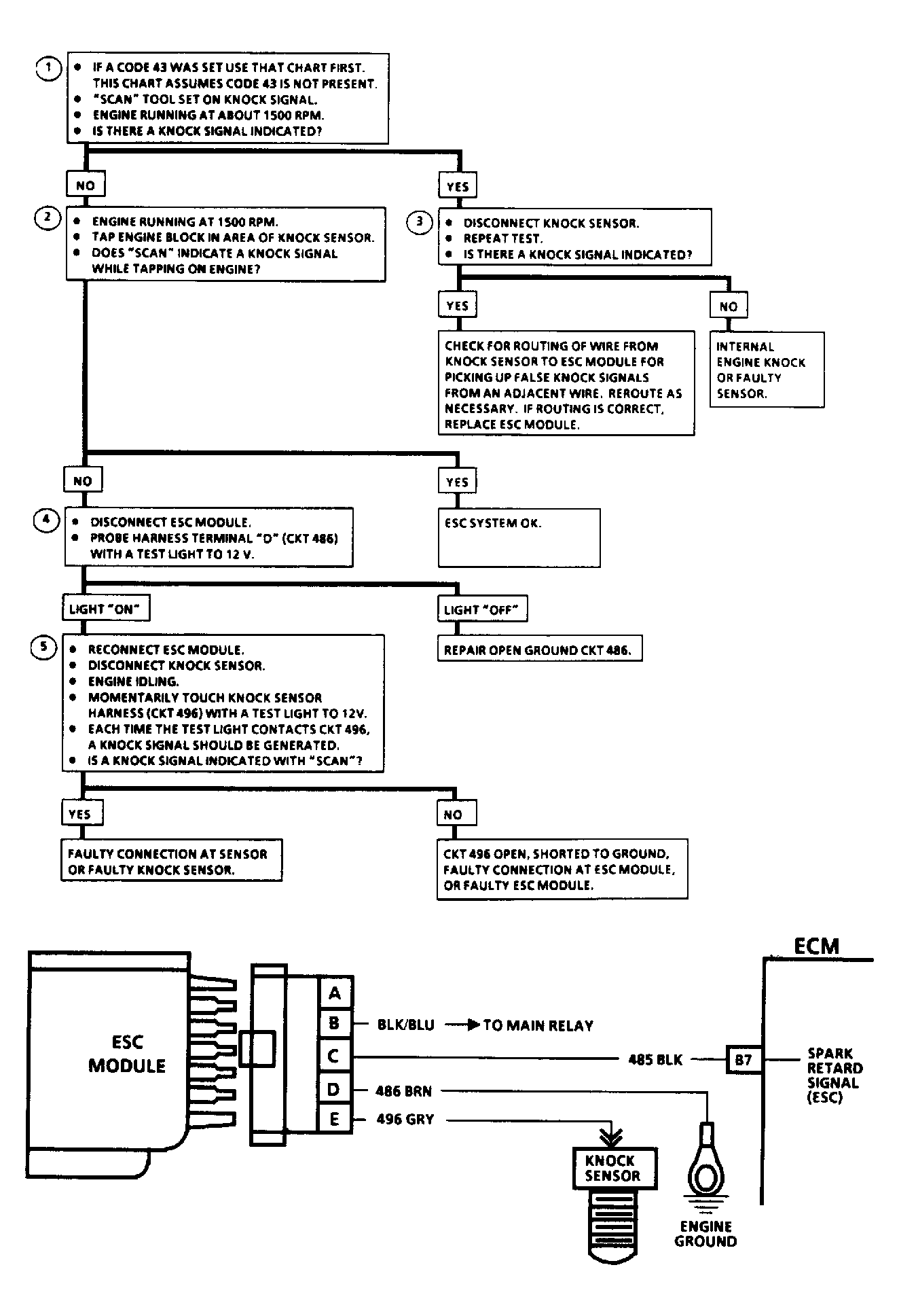 - Using a test light from 12 volts at circuit No. 496 should generate a knock signal to determine whether the knock sensor is at fault or the ESC module can't recognize a knock signal.