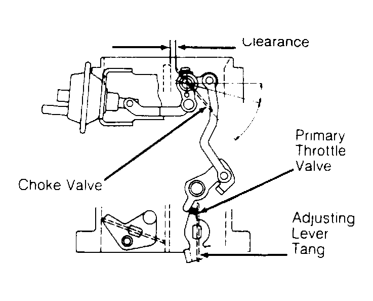 Fully open primary throttle valve. Measure clearance between choke valve and choke valve chamber wall. See Fig 1. Clearance should be.106-.130" (2.70-3.30 mm). Choke valve angle should be 50 degrees. If clearance is not as specified, bend adjusting lever tang.