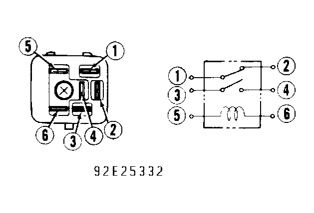 - Apply battery voltage between terminals No. 5 and 6. Ensure continuity is present between terminals No. 3 and 4. Ensure continuity is not present between terminals No. 1 and 2. Replace relay if defective.