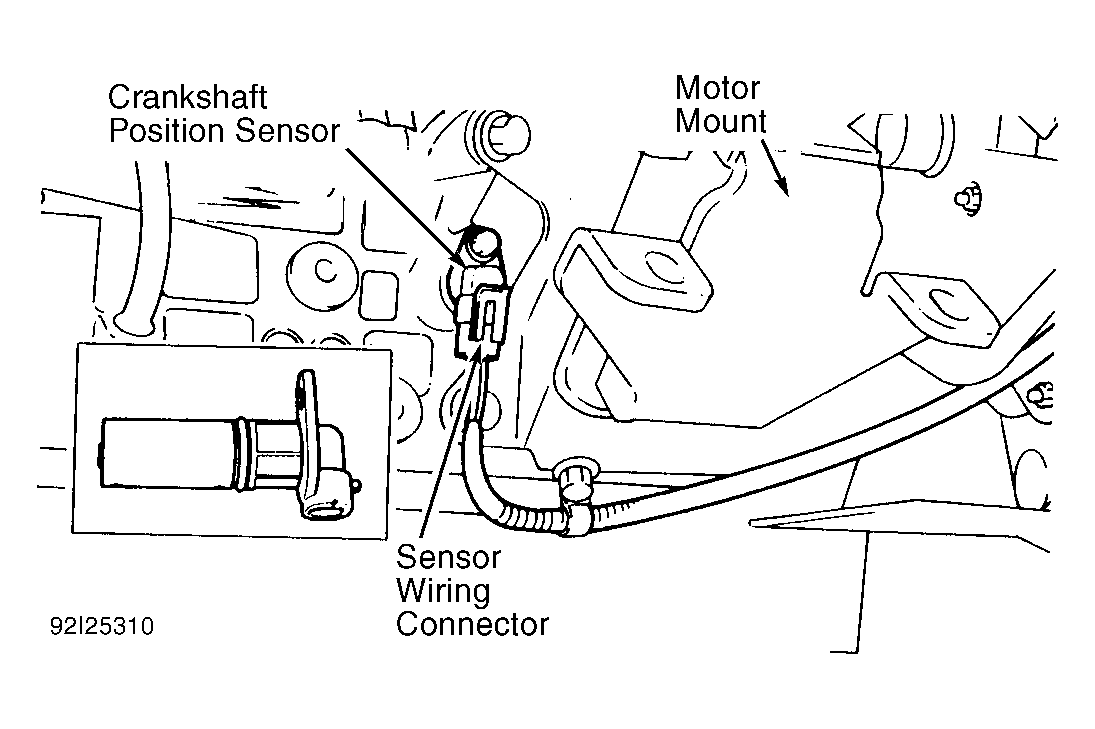 - Remove negative battery cable. Remove right side exhaust shield. Disconnect front drive shaft yoke. Remove crank angle sensor wiring connector located on right side of block, behind motor mount. See Fig 1. Remove sensor mounting nut and sensor.