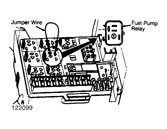 - Remove fuel pump relay from underhood fuse/relay box. Connect a jumper wire between terminals No. 1 and 3 of fuel pump relay connector in fuse block. See Fig 3