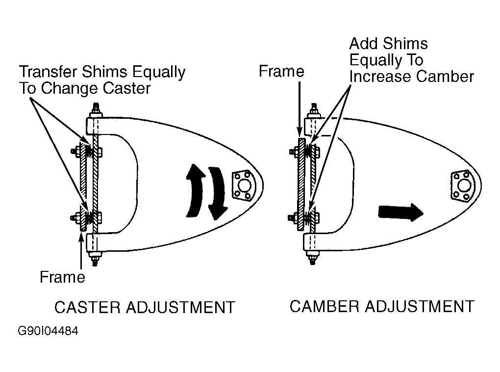 Adjust caster by inserting or removing shims between upper control arm pivot shaft and frame. See Figure .
