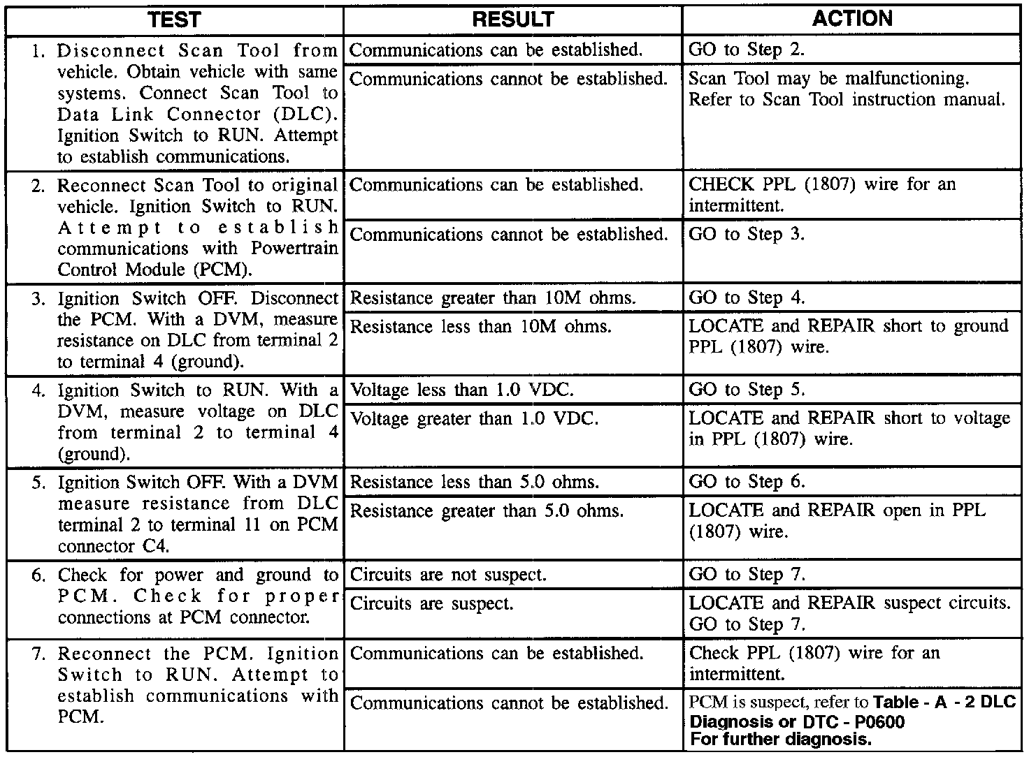 3. If PCM is not accessible with a Scan Tool, check for an open in PPL (1807) wire between component and DLC terminal 2.