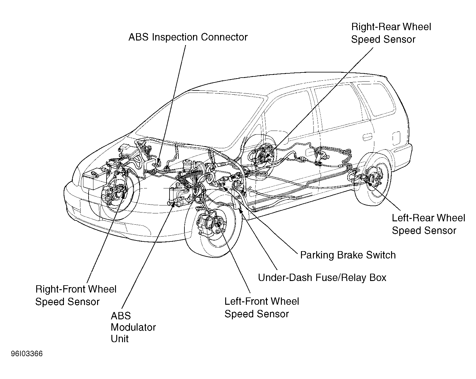 | ABS Modulator Unit | Left side of engine compartment. See Figure . |