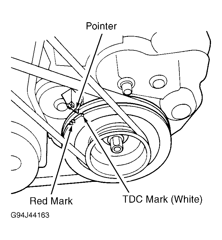 - Attach a tachometer to the tachometer test connector (White, 2-pin with cover) located in the right rear of engine compartment. Check idle speed and adjust as necessary. See IDLE SPEED under IDLE SPEED & MIXTURE. Connect timing light to spark plug wire No. 1. Check base ignition timing. Timing marks are located on the timing belt cover and crankshaft pulley. Red mark indicates 15 degrees BTDC. The White mark indicates TDC. See Fig 2 . Also, refer to the IGNITION TIMING table.