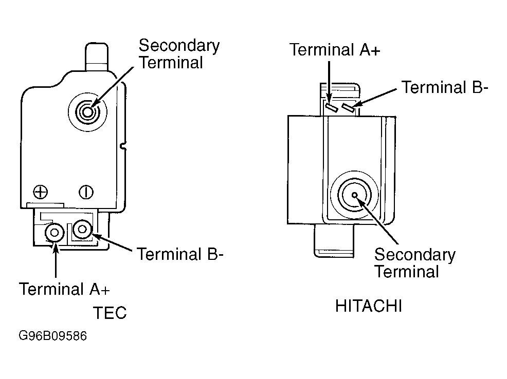 - Turn ignition off. Remove distributor cap. Remove primary leads from ignition coil. Using an ohmmeter, check primary resistance between ignition coil terminals "A" (+) and "B" (-). See Fig 1. Resistance should be as specified. See IGNITION COIL RESISTANCE table.