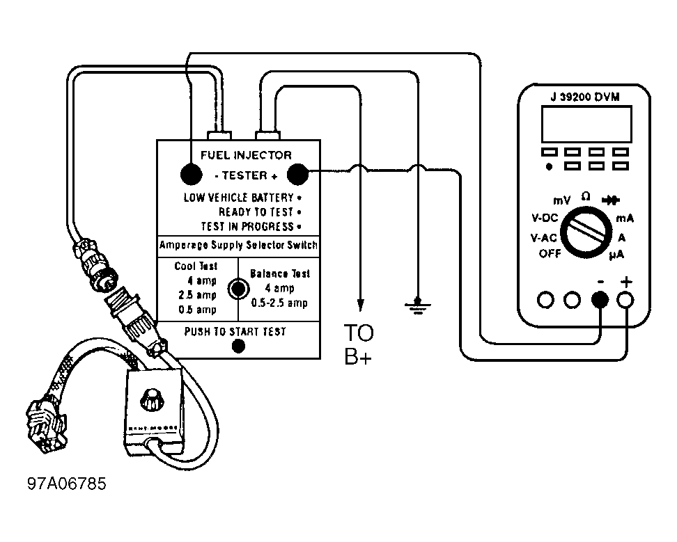 - Turn ignition off. Relieve fuel pressure. See FUEL SYSTEM PRESSURE RELEASE. Connect Fuel Injector Tester (J 39021-5V) to battery positive and ground, and Injector Switch Box (J 39021-90). Connect switch box to grey fuel injector harness connector located at front of EVAP canister bracket. Set amperage supply selector switch to Coil Test 0.5 amp position. Connect DVOM leads to fuel injector tester. See Fig 1