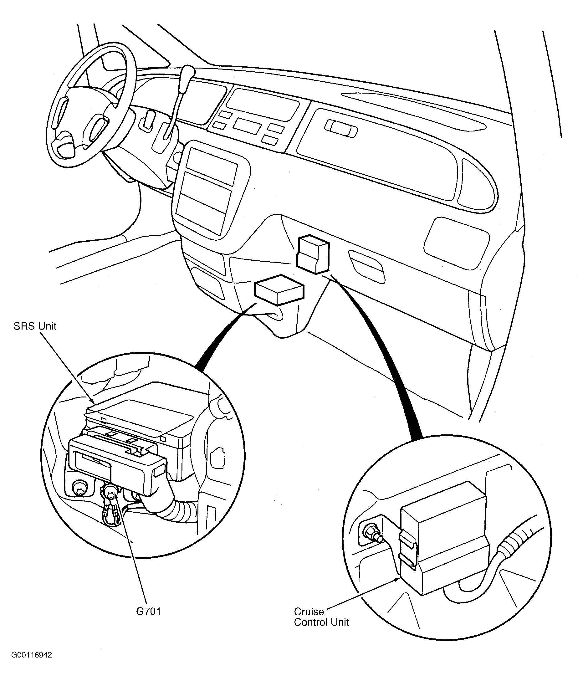 | Cruise Control Unit | Below center of dash, forward of SRS unit. See Figure . |