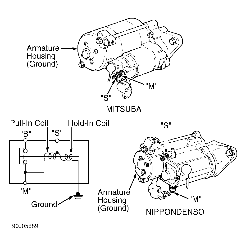 Check continuity between starter solenoid terminals "S" and "M". See Figure . If continuity exists, pull-in coil is okay. If continuity does not exist, replace starter solenoid.