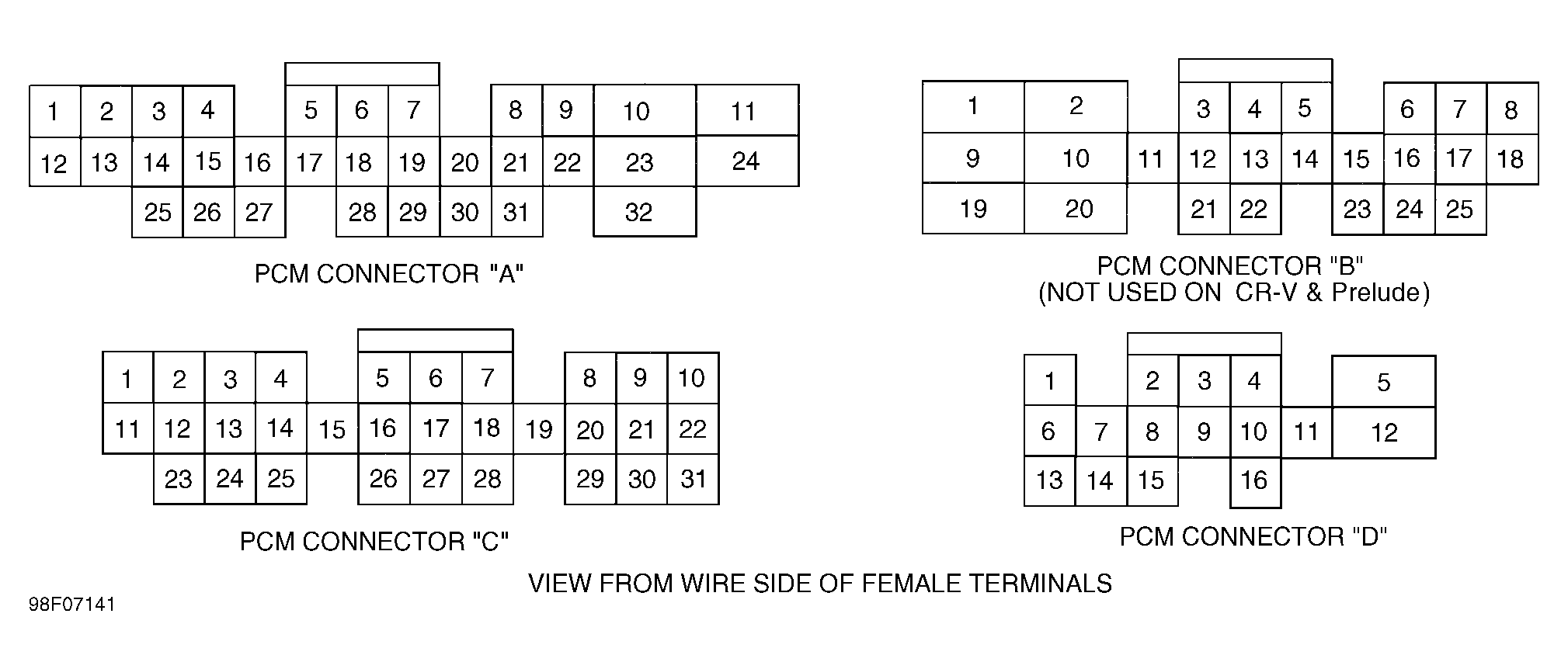 - Measure voltage between PCM connector terminals A32 and B20 (Accord, CR-V, Oasis & Odyssey) or terminals A9 and D5 (Civic & Prelude). See Figure . If battery voltage exists, brake switch signal is okay. If battery voltage does not exist, repair open in wire between PCM connector terminal B20 (Accord, CR-V, Oasis & Odyssey) or terminal D5 (Civic & Prelude) and brake light switch. See WIRING DIAGRAMS article.