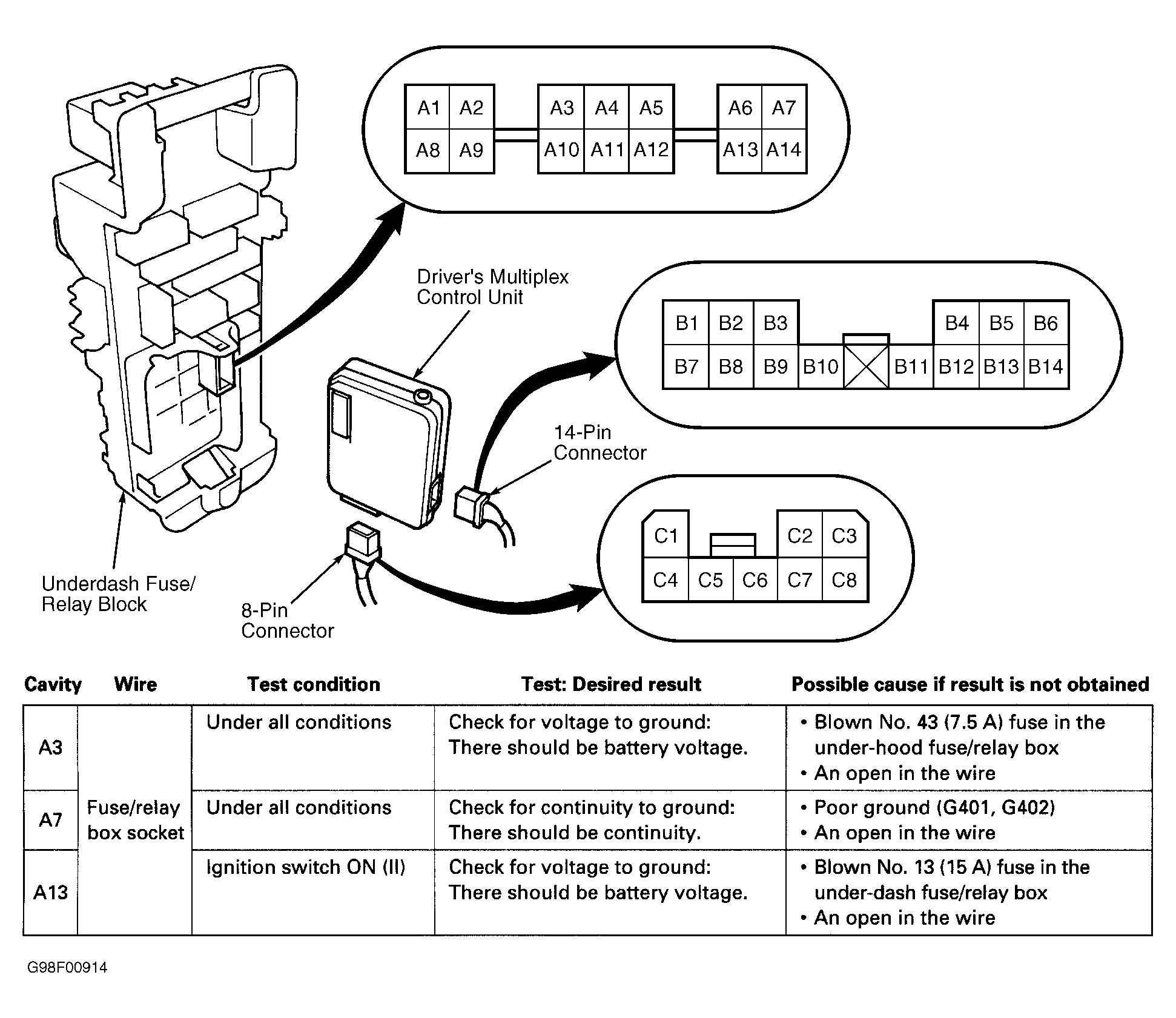 Turn ignition off. Remove driver's multiplex control unit from fuse/relay block behind left kick panel. See Fig 1 . Check terminals and contacts. Repair as necessary and retest system. If terminals and contacts are okay, perform input tests. See Fig 1 . If test results are as specified, replace driver's multiplex control unit (mounted on fuse/relay block). See REMOVAL & INSTALLATION .