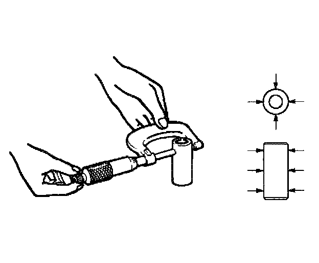 Use a micrometer to measure the new piston pin outside diameter in both directions at three different positions. Measure the inside diameter of the connecting rod small end. If the fitting interference between the small end and pin does not conform to the specified value, the connecting rod must be replaced.