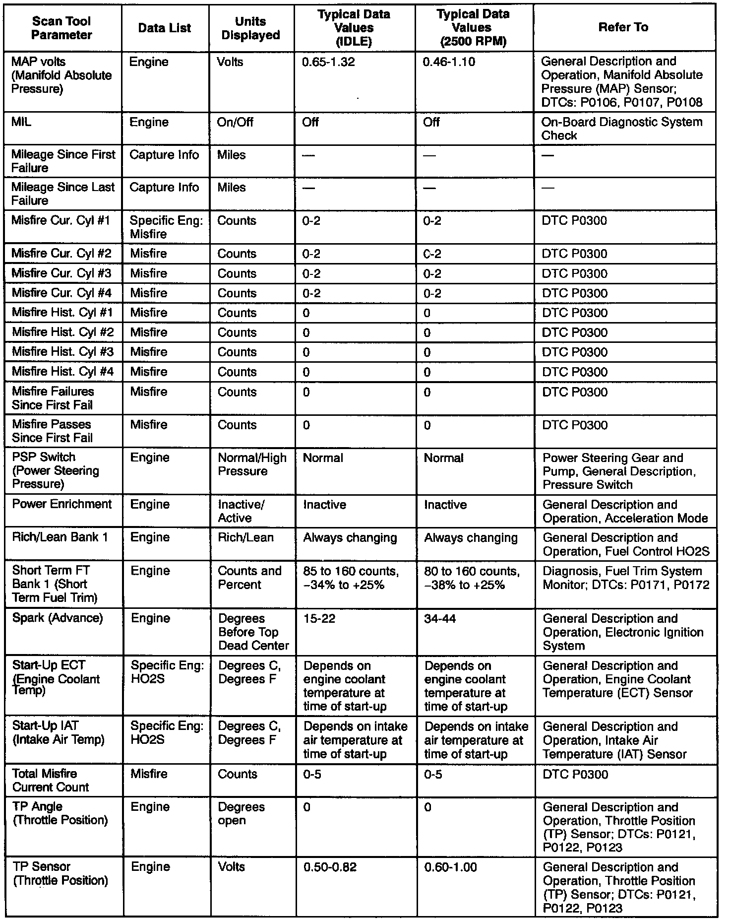 Use the Typical Scan Data Values Table only after the On-Board Diagnostic System Check has been completed, no DTC(s) were noted, and you have determined that the on-board diagnostics are functioning properly. Scan Tool values from a properly-running engine may be used for comparison with the engine you are diagnosing. The typical scan data values represent values that would be seen on a normally-running engine.