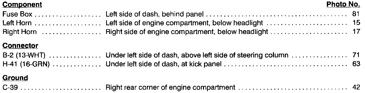 A component location index as shown in diagram shows each schematic. Except for the location of obvious components like Left Headlight, the index lists the location of every component, connector and ground in the schematic. The index also gives references to component location photographs. The number of cavities in each connector and the connector color is also listed. Wires may not be used in all connector cavities.