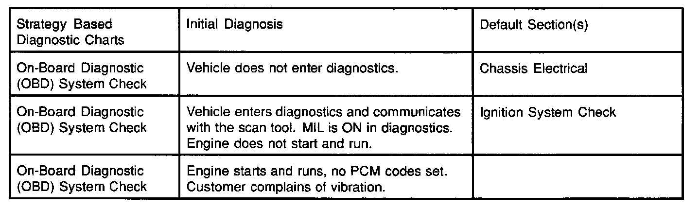 A referral strategy has been established to assist the technician with additional information when the cause of the failure cannot be determined. If no problem is found after performing diagnostics, then refer to the default matrix table for further diagnostic information.