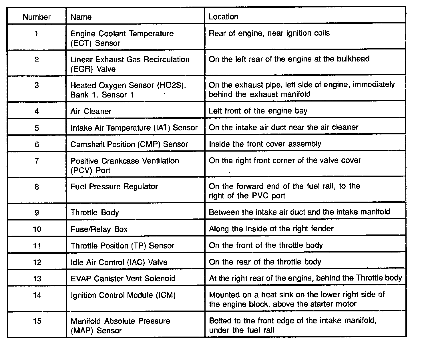 Engine Component Locator Table: