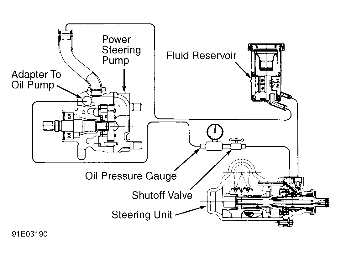 - Ensure pressure gauge shutoff valve is open. Start engine and let idle for at least 2 minutes. Check fluid level in reservoir and refill if needed. Turn steering wheel from lock-to-lock several times until fluid has reached normal operating temperature. Have another technician hold steering wheel at full-lock position for less than 5 seconds.CAUTION: DO NOT close shutoff valve for more than 5 seconds. Severe pump damage will result.