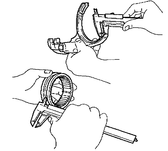 2. Using a vernier caliper, measure the center groove of hub sleeve No.3. Calculate the clearance between the hub sleeve No.3 and shift arm.