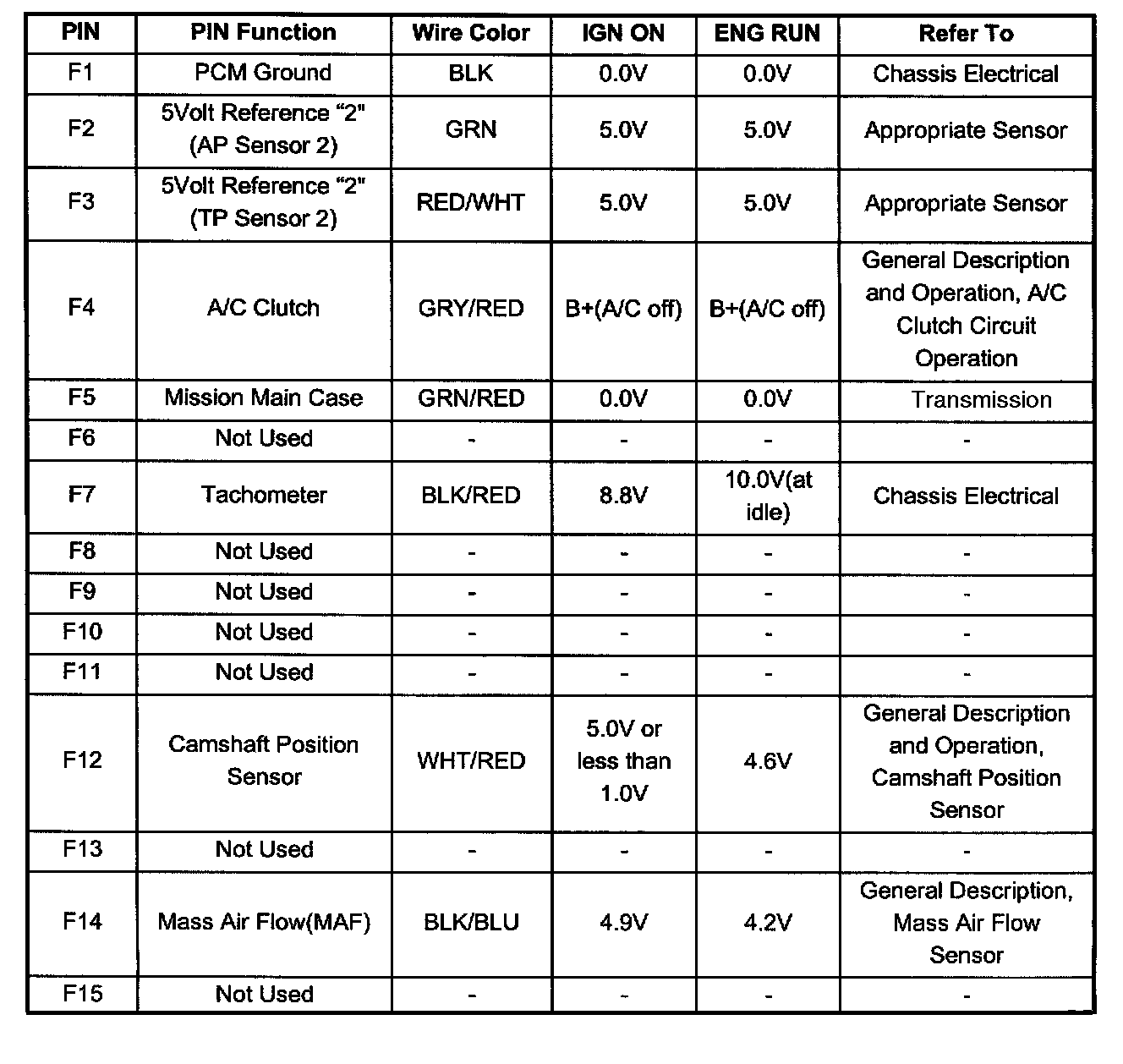 PCM Pinout Table, 80-Way Blue Connector - Row "F1 - 20" (F1 To F15):
