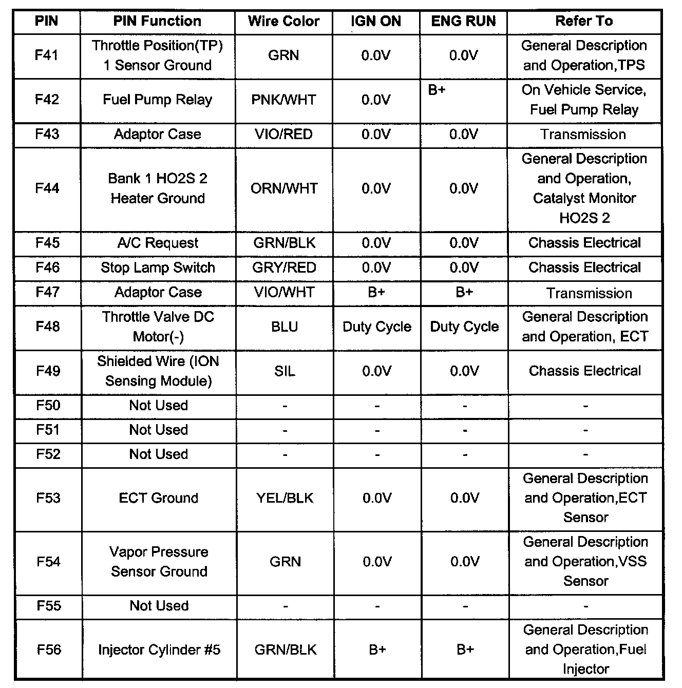 PCM Pinout Table, 80-Way Blue Connector - Row "F41 - 60" (F41 To F56):