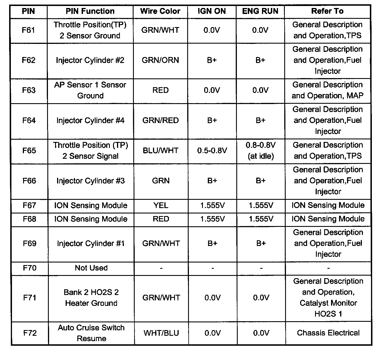 PCM Pinout Table, 80-Way Blue Connector - Row "F61 - 80" (F61 To F72):