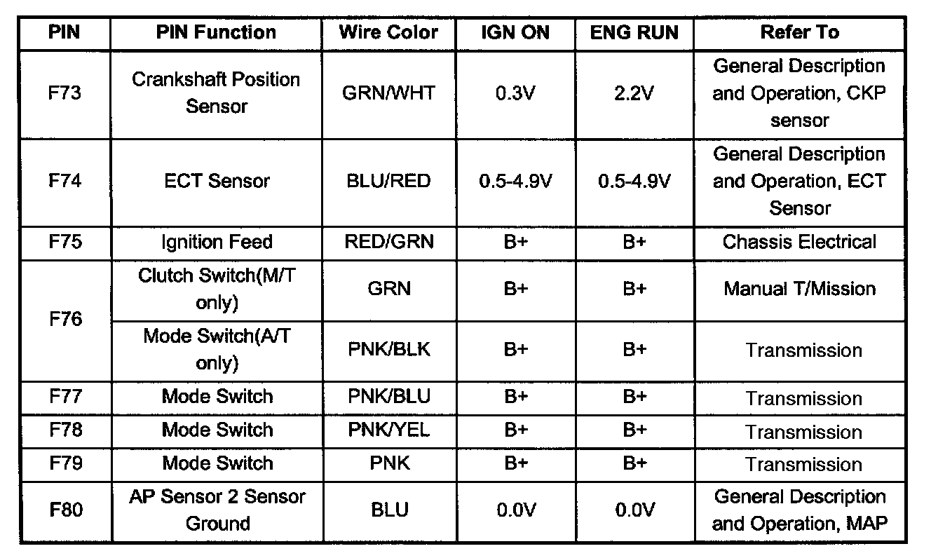 PCM Pinout Table, 80-Way Blue Connector - Row "F61 - 80" (F73 To F80):