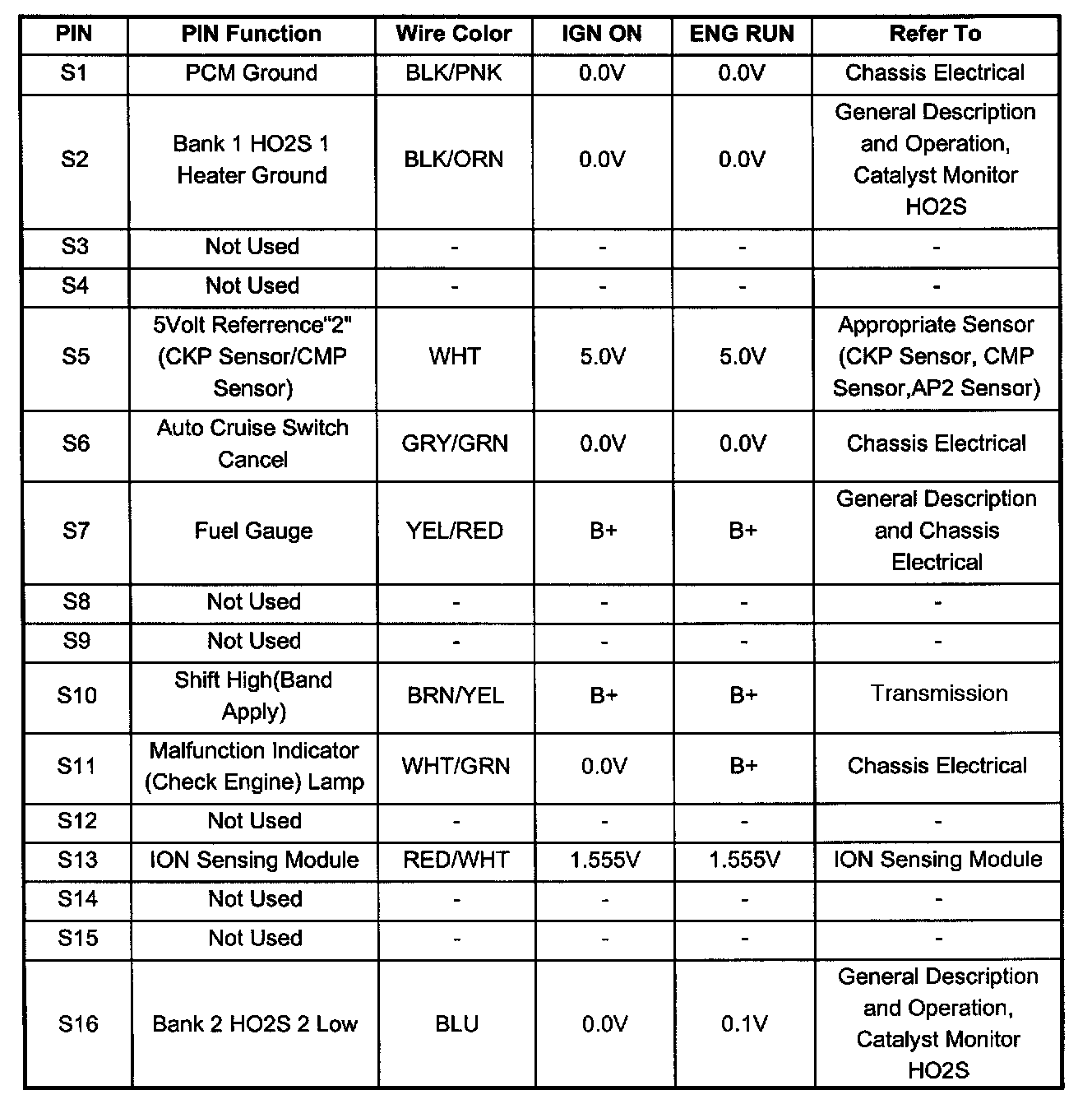 PCM Pinout Table, 80-Way Red Connector - Row "S1 - 20" (S1 To S16):