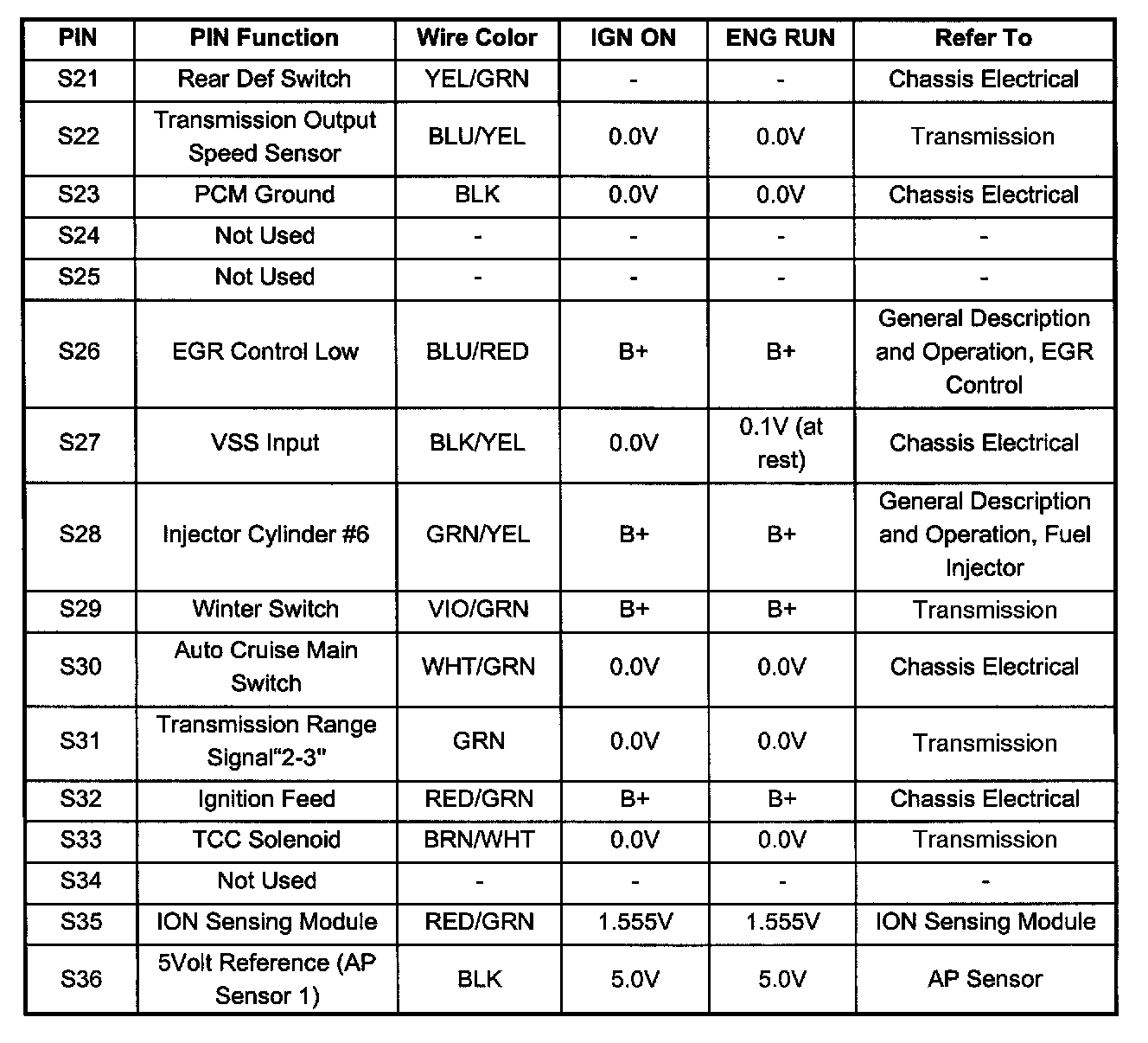 PCM Pinout Table, 80-Way Red Connector - Row "S21 - 40" (S21 To S36):