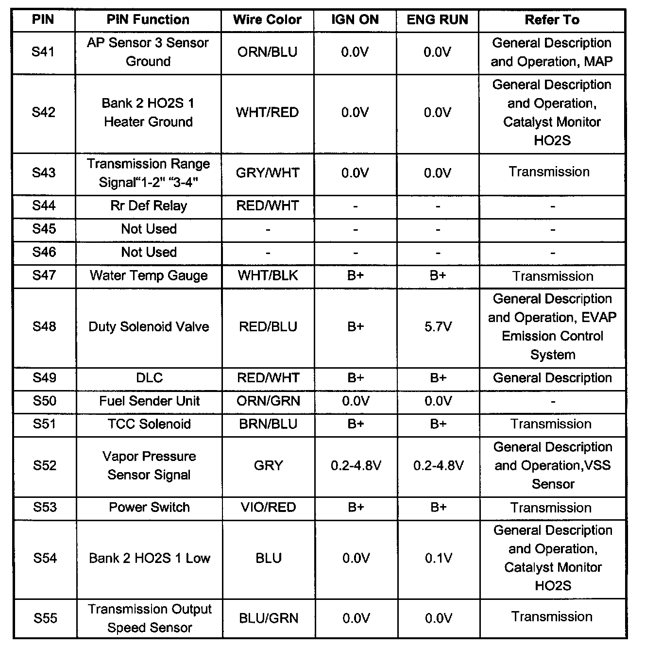 PCM Pinout Table, 80-Way Red Connector - Row "S41 - 60" (S41 To S55):