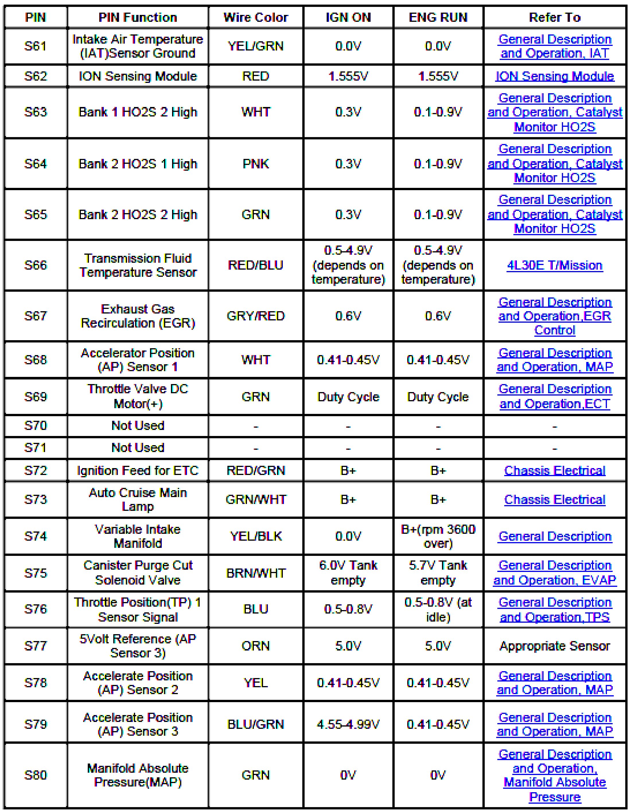 PCM Pinout Table, 80-way Red Connector - Row "S61-80":