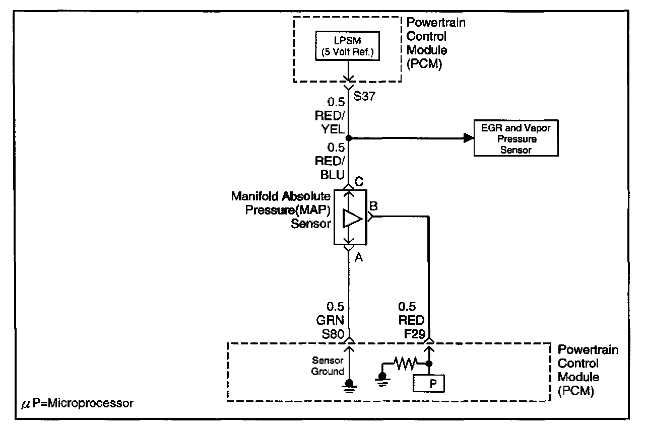 The manifold absolute pressure (MAP) sensor measures the changes in the intake MAP which result from engine load (intake manifold vacuum) and engine speed changes; and converts these into a voltage output. The powertrain control module (PCM) sends a 5-volt reference voltage to the MAP sensor. As the MAP changes, the output voltage of the sensor also changes. By monitoring the the sensor output voltage, the PCM knows the MAP. A lower pressure (low voltage) output voltage will be about 1 - 2 volts at idle. Higher pressure (high voltage) output voltage will be about 4 - 4.8 volts at wide open throttle. The MAP sensor is also used, under certain conditions, to measure barometric pressure, allowing the PCM to make adjustments for different altitudes. The PCM uses the MAP sensor to diagnose proper operation of the EGR system, in addition to other functions.