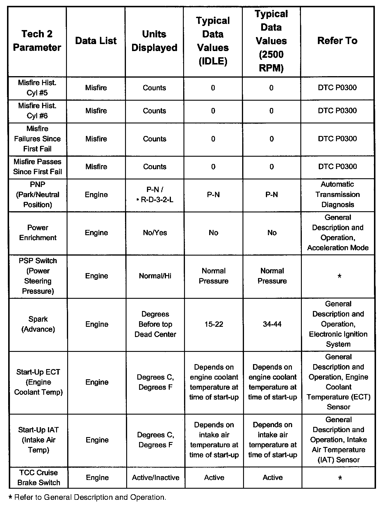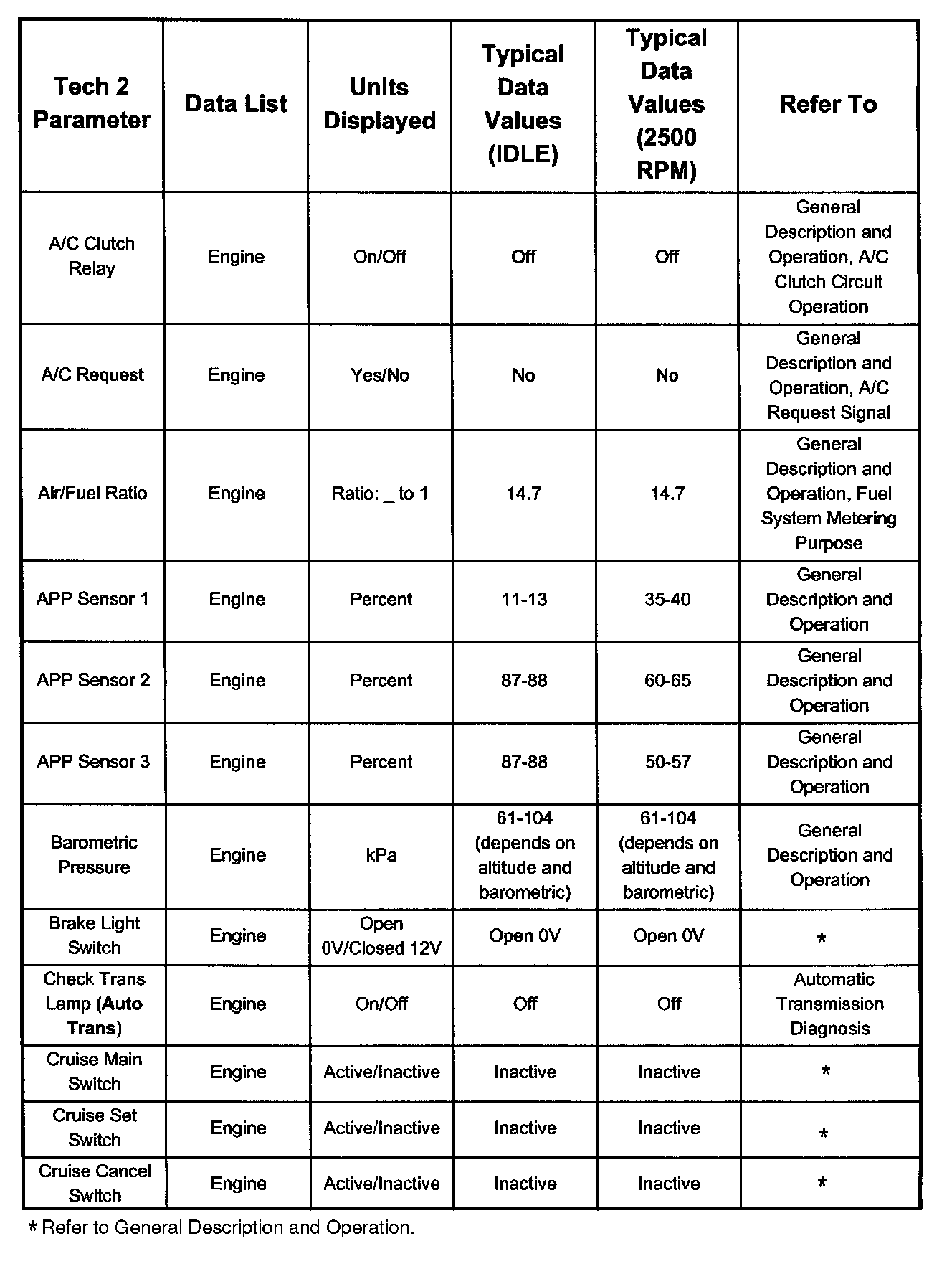 Only the parameters listed below are referred to for use in diagnosis. For further information on using the Tech 2 to diagnose the PCM and related sensors, refer to the applicable listed below. If all values are within the typical range described below, refer to Diagnosis by Symptom.