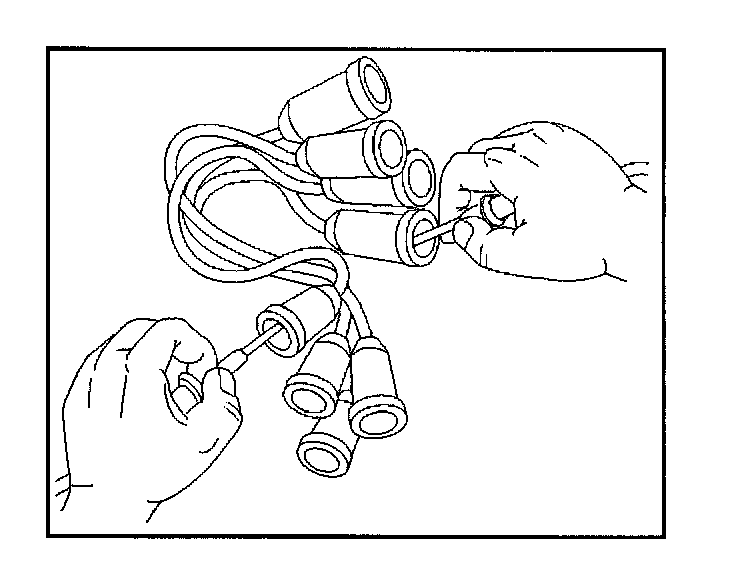 Spark Plug CablesNOTE: Never puncture the spark plug cable's insulation with a needle or the pointed end of a probe into the cable. An increase in resistance would be created which would cause the cable to become defective.