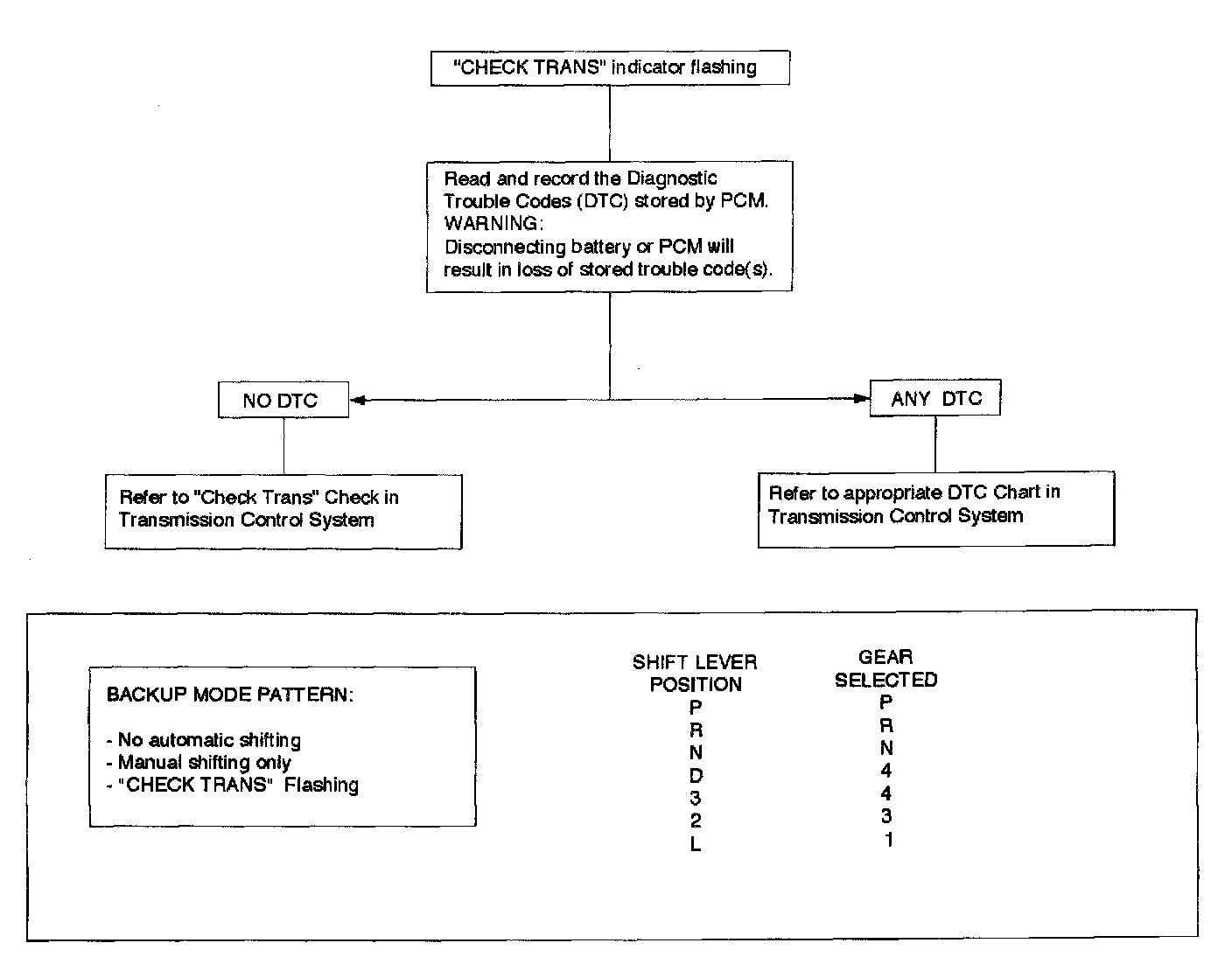 When the "CHECK TRANS" indicator is flashing, it indicates that a problem related to the transmission, the Powertrain Control Module (PCM), or the vehicle harness has occurred. The system is now operating in a "BACKUP MODE" where the risk of further damaging the transmission has been reduced. The vehicle may be shifted manually. If the initial problem is intermittent or seldom, switching the engine OFF/ON might allow normal operation again until the problem reoccurs.