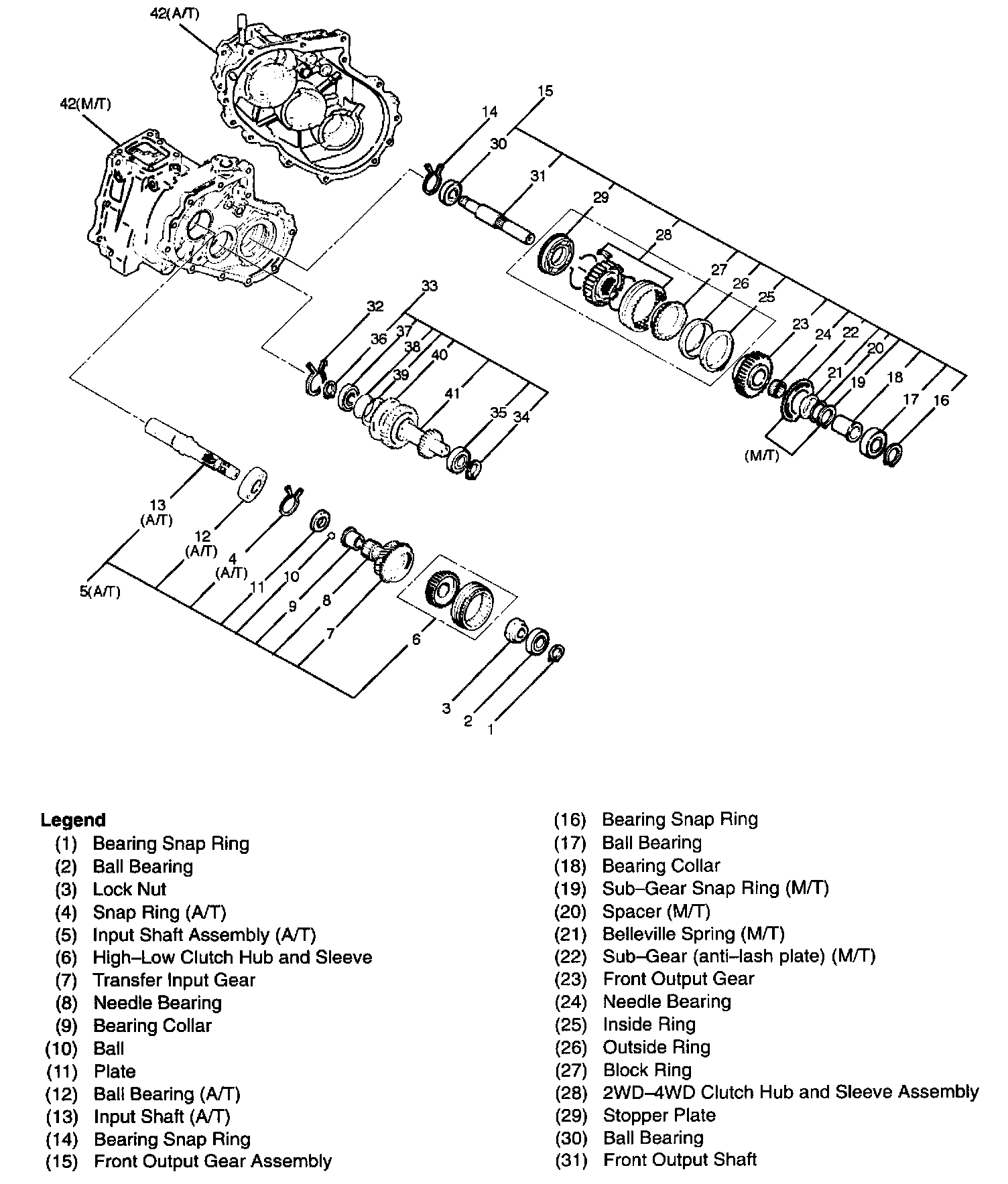 7. Remove the input shaft assembly (5) from the transfer case (42). (A/T)