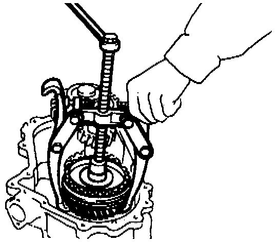8. Use the universal puller to remove the high-low clutch hub and sleeve (6), and transfer input gear (7).