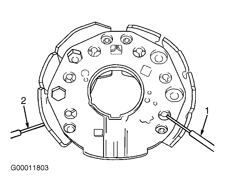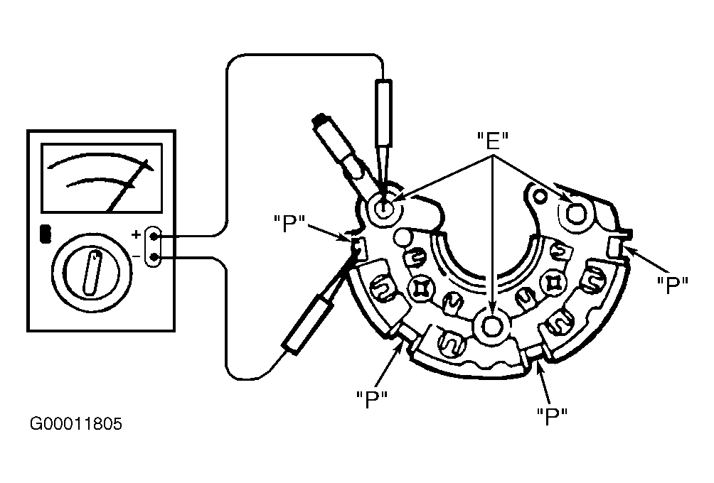 Using an ohmmeter, check continuity of diodes in both directions. See Fig 1-Fig 3 . Continuity should be present in one direction only. If there is continuity in both directions, diode is shorted. If there is no continuity in either direction, diode is open. If any diode is defective, replace entire rectifier assembly. See OVERHAUL .
