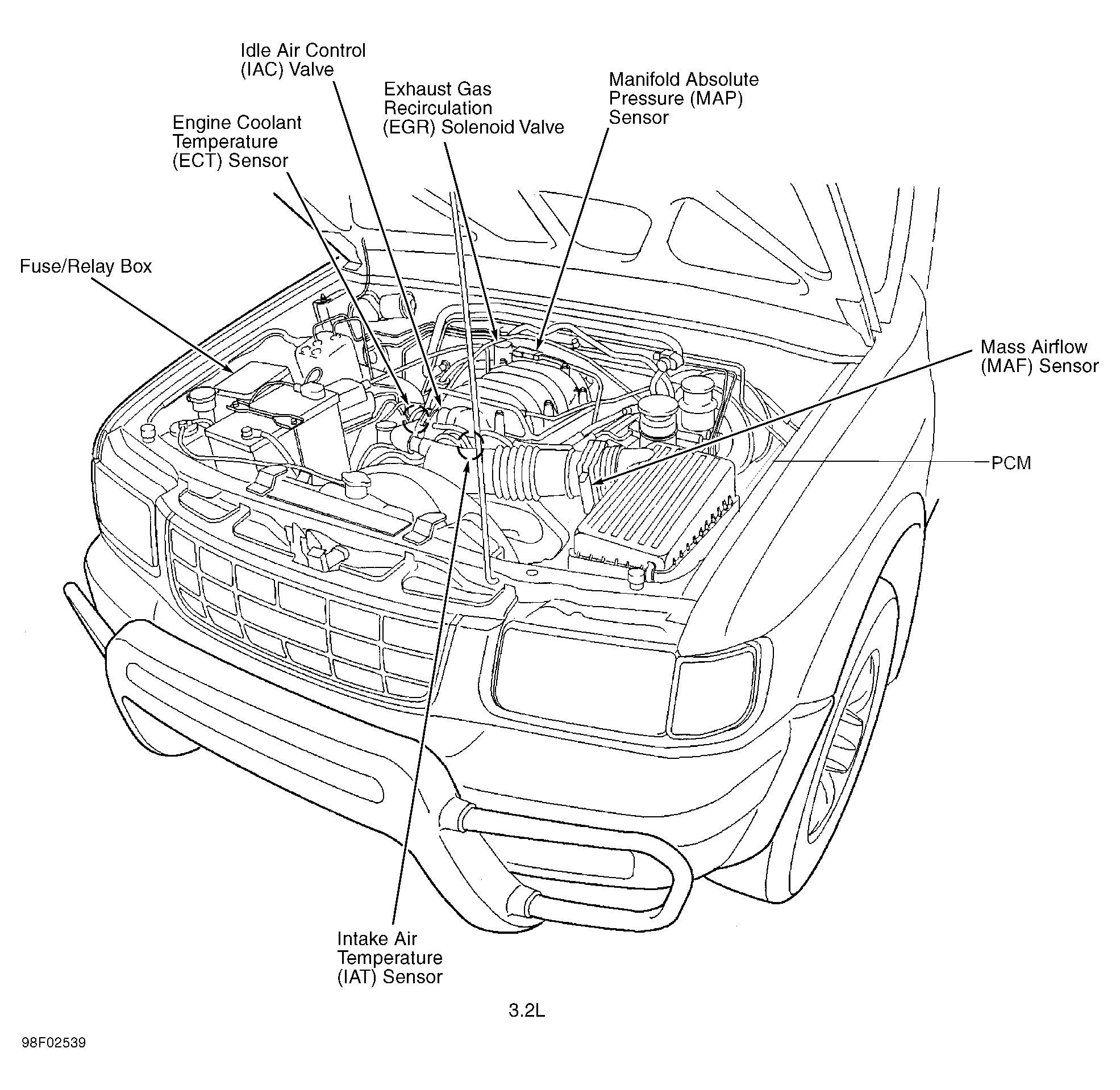 | Fuse/Relay Box (3.2L) | On right side of engine compartment. See Figure. |