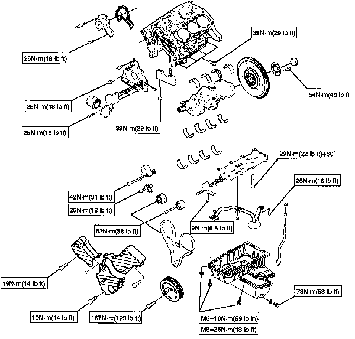 Crankshaft main bearing, Flywheel, Crankcase, Oil pan, Timing belt tensioner, Timing pulley, Timing belt cover, Oil pump, Oil gallery, Oil strainer and water pump