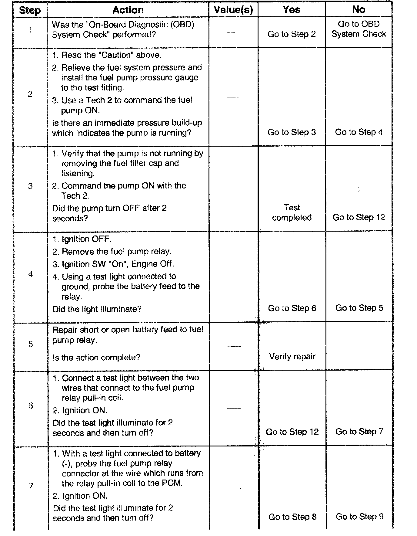 2. If the fuel pump is operating but incorrect pressure is noted, the fuel pump wiring is OK and the "Fuel System Pressure Test" chart should be used for diagnosis.
