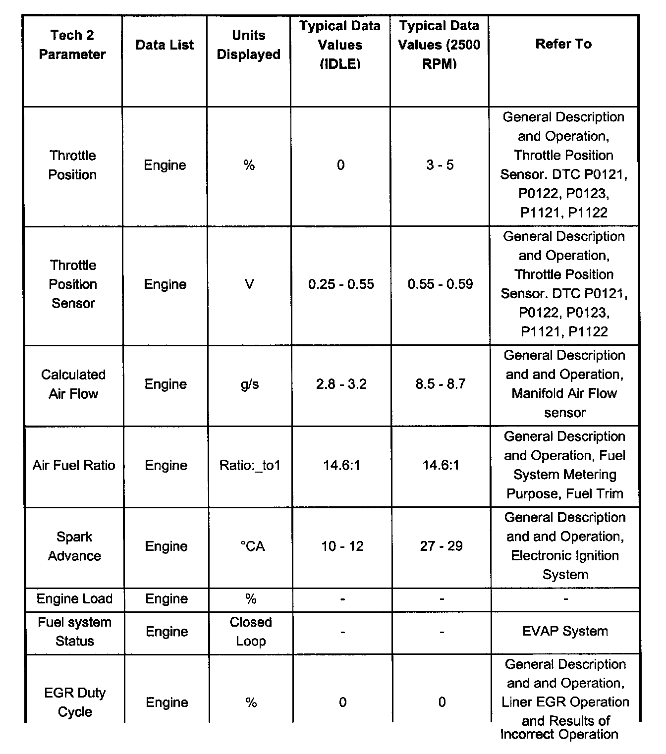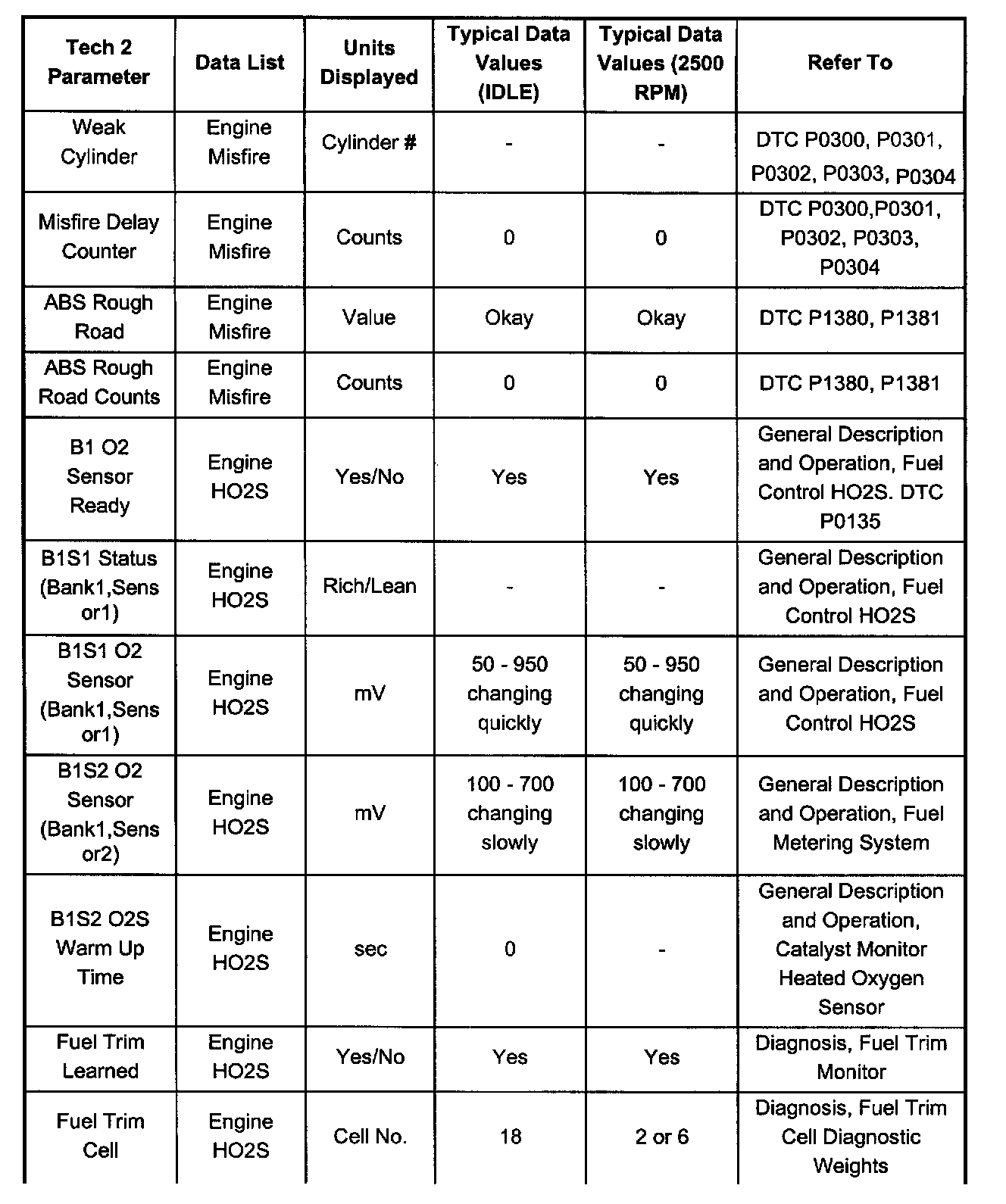 Only the parameters listed below are referred to for use in diagnosis. For further information on using the Tech 2 to diagnose the PCM and related sensors, refer to the applicable listed below. If all values are within the typical range described below, for diagnosis, refer to Diagnosis by Symptom.