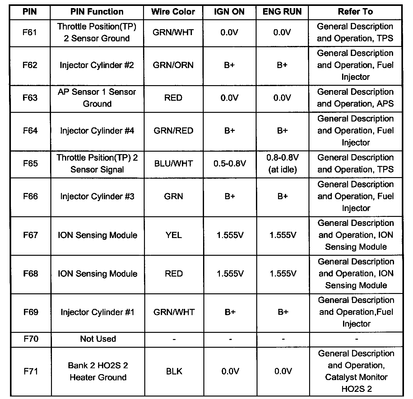 PCM Pinout Table, 80 - Way Blue Connector - Row "F61 - 80" (F61 To F71):